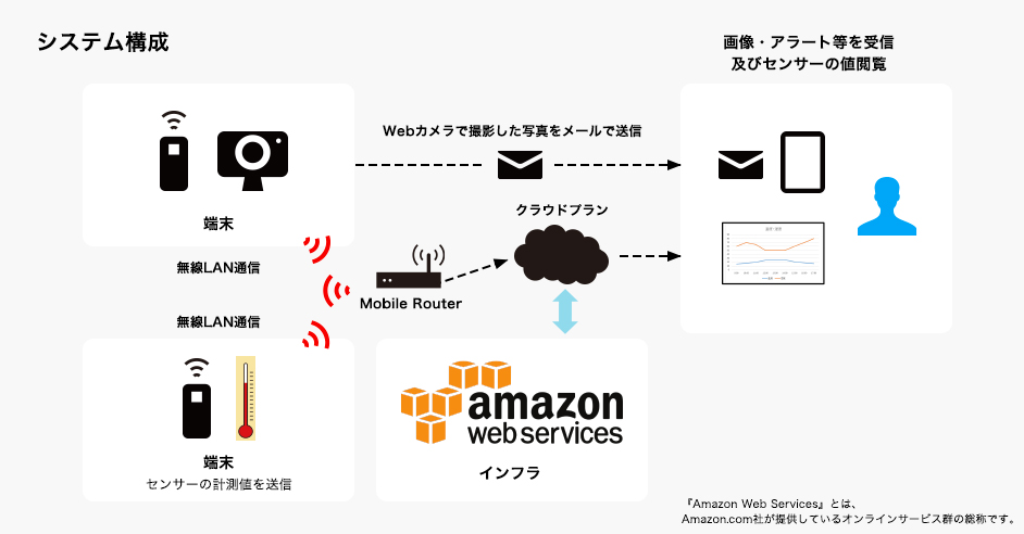 専用の端末を導入して頂きます。その端末よりクラウド上に集約し、Webアプリにて参照できるプランです。