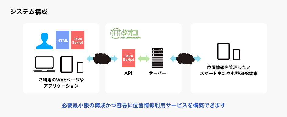 ジオコはGPSによる位置情報の利用を容易に実現するAPIサービスです。JavascriptのAPIとなっており、サーバ側の構築を意識することなく、ご利用のWebページやアプリケーションへの地図表示の組み込みが可能です。利用できるGPS端末はスマートフォンに加え、小型GPS端末にも対応しており、小型GPS端末本体の提供も含めたサービスとしてもご利用できます。
